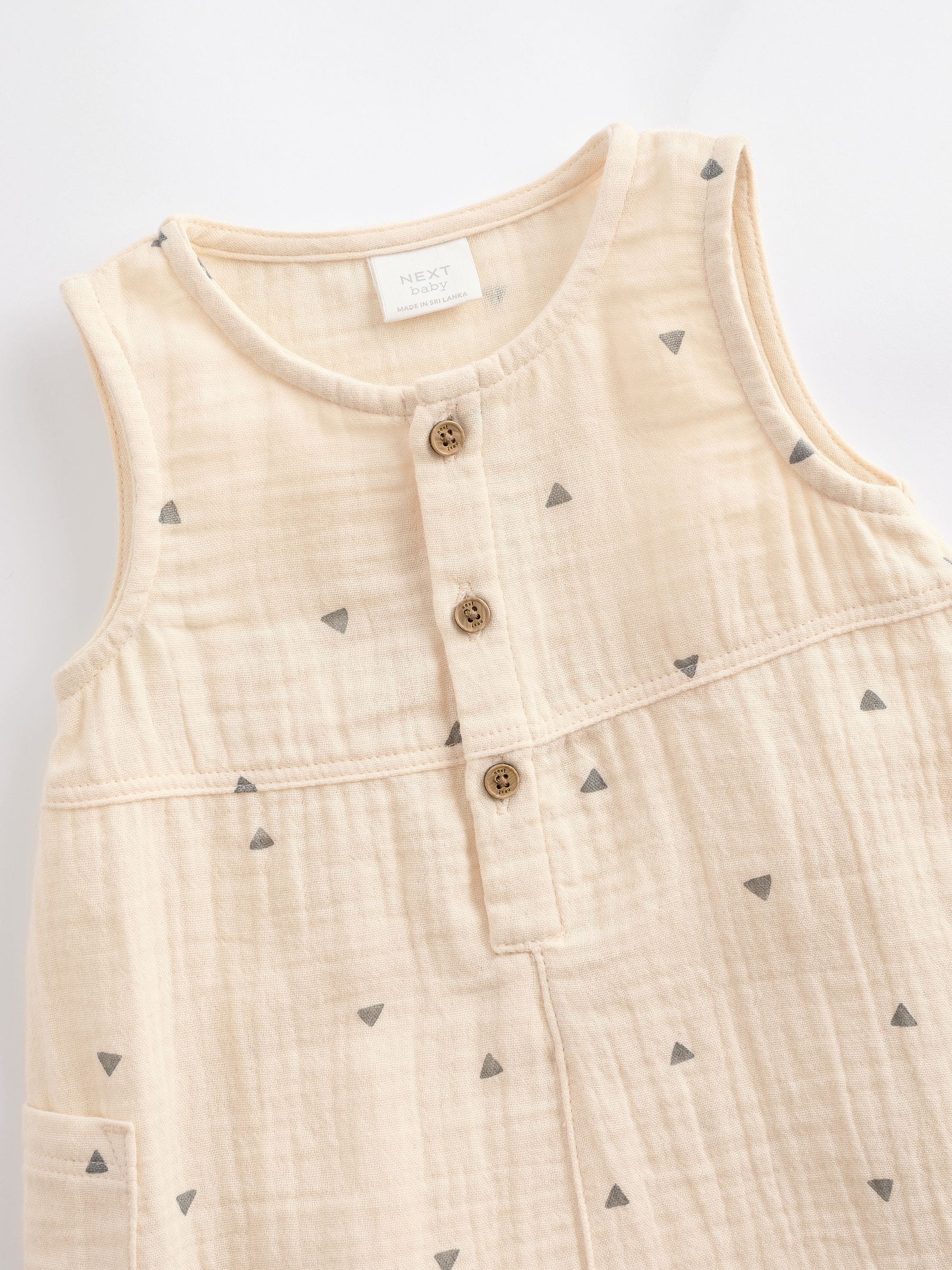 This adorable sleeveless jumpsuit is made from a soft cotton, with a front button placket design, full-length legs and a popper fastening to the crotch for easy changing, finished with a round collar.